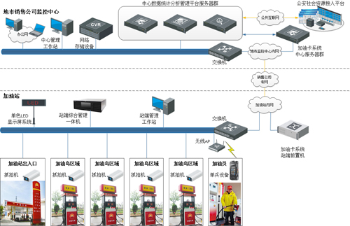 加油站車牌識別及客戶服務系統由站端系統(部署在加油站)、傳輸網絡和中心系統(部署在地市銷售公司監控中心)這三個相互銜接、缺一不可的部分組成。