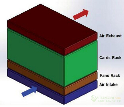 冷卻系統(tǒng)的組織,是為了使其符合機(jī)架供應(yīng)商的標(biāo)準(zhǔn)。如圖1所示,其顯示了我們最終的設(shè)計(jì)草圖。進(jìn)氣口是在前端的底部,而空氣的排出口是在頂部的背面或頂部。空氣流是從機(jī)架的底部流到頂部。最小空氣流量為每秒0.2立方米(m3/s)或420立方英尺每分鐘(cfm)。這一空氣流被定義了,以便該系統(tǒng)將能夠與現(xiàn)有的卡和機(jī)架向后兼容。機(jī)架的大小被固定在大約0.4 m x 0.44 m x 0.25 m (H x W x D),這意味著系統(tǒng)中的空氣每秒將被替換約四次。