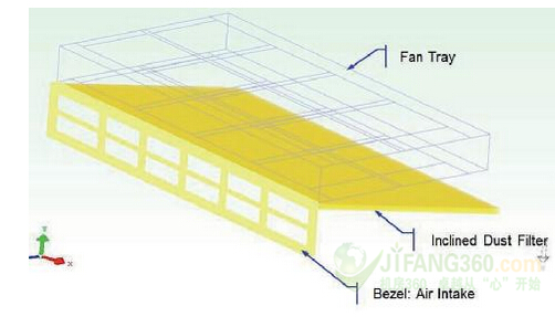 保持過濾器與風(fēng)扇的平行是一大擁有其主要優(yōu)勢的選擇:過濾器的提取非常符合人體工程學(xué)。我們不得不增加系統(tǒng)高度至25毫米,同時(shí)將過濾器的尺寸被限制為系統(tǒng)的深度和寬度。增加表面應(yīng)減少壓力下降,同時(shí)增加維修的次數(shù)。使用進(jìn)氣口對角線來增加表面的空氣進(jìn)入量。這個(gè)概念在空調(diào)系統(tǒng)中經(jīng)常被使用。我們證實(shí)了這一定位,如圖3所示,其可以說是最好的模擬。