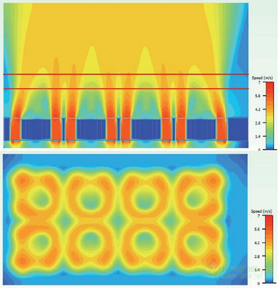 圖8:風(fēng)扇后的速度分布后;頂部垂直切割,具有兩條線設(shè)置50和75毫米的位置(約2和3英寸。),底部是水平橫剪為50毫米(0.2立方米/秒)。