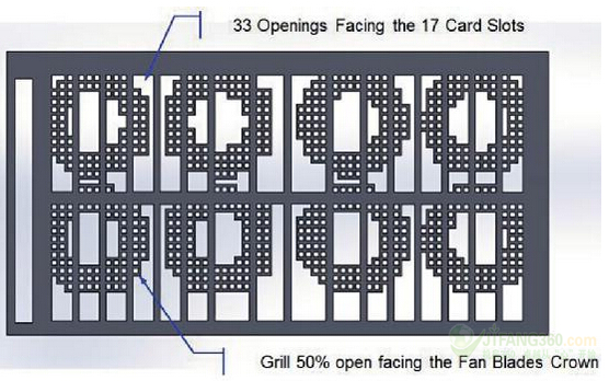 我們創(chuàng)建了一個(gè)多孔板,其具有兩個(gè)主要功能:1)在沒有插槽的地方停止氣流流動,以避免將空氣吹入封閉的EMI屏蔽物;2)在我們觀察到較高的氣流速度的區(qū)域減少氣流流動。這個(gè)多孔流體分配板(FDP),如圖9所示,必須是與該EMI屏蔽接觸。其將從而在入口處關(guān)閉,由卡機(jī)架的另一側(cè)已經(jīng)關(guān)閉了蜂窩孔格封閉。因?yàn)榘宀恍枰S護(hù),它可以連接到EMI屏蔽代替風(fēng)扇機(jī)架。風(fēng)扇和該多孔板之間的距離是至關(guān)重要的。氣流必須能夠被通過開口槽而不產(chǎn)生不可接受的壓力下降。