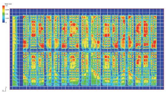 在創(chuàng)建一個(gè)組件,使每個(gè)插槽的氣流均勻統(tǒng)一之前,我們決定看看仿真模擬空氣流量,而不考慮漩渦。我們觀察到在遠(yuǎn)離風(fēng)扇75毫米的一定距離,速度變化仍然非常重要(圖8)。