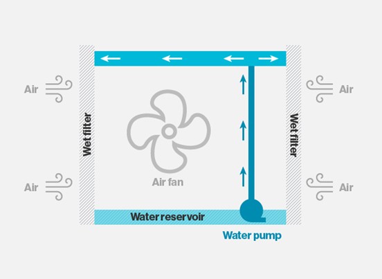 要冷卻數據中心,一個小功率的泵或重力給料系統持續不斷地向一組具備巨大蒸發面積的纖維簾上噴水霧。一個小功率的風扇配合風道迫使空氣通過這些濕簾。空氣流穿過濕簾的過程中,部分水被蒸發,結果導致空氣流出一側的空氣溫度會比入口側冷得多。(見圖1)。